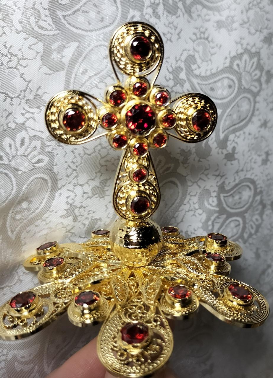 Хрест для митри з дорогоцінним камінням — це витончена ювелірна робота, створена вручну майстрами з багаторічним досвідом. Основою виробу є мідь із надійною позолотою, що надає хресту шляхетного блиску та довговічності. Кожен камінь закріплений, а сама форма витримана у традиційному церковному стилі.